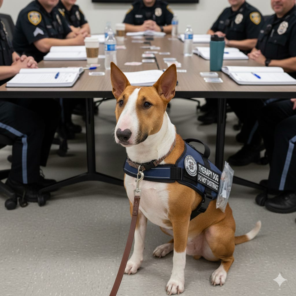 By the time Jacquie walked into the police station with Sparks at her side and her training kit rolling behind her, the dog was all business.